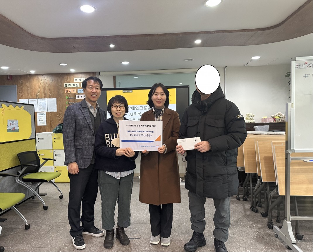 설 명절을 앞두고 장애인고용공단 서울북부지사에서 따뜻함을 나눠주셨어요~ 페이지 정보 작성자 관리자 댓글 0건 조회 20회 작성일 26-02-12 10:30 본문 안녕하세요~ 어느덧 설 명절이 다가왔어요^^항상 명절을 앞두고 따뜻한 마음을 나눠주시는 장애인고용공단 서울북부지사에서 이번에도 방문해 주셨어요.임직원들의 마음을 모아 정혜영 지사장님, 진홍섭 취업지원부장님, 조혜영 담당자님이 이룸으로 직접 찾아오셨어요.덕분에 풍성한 설 명절을 보낼 수 있을 것 같습니다.늘 감사드립니다.모두 새해 복 많이 받으시고 건강하세요~ 목록 다음글문화활동 다녀왔어요 26.01.28 댓글목록 댓글목록 등록된 댓글이 없습니다.